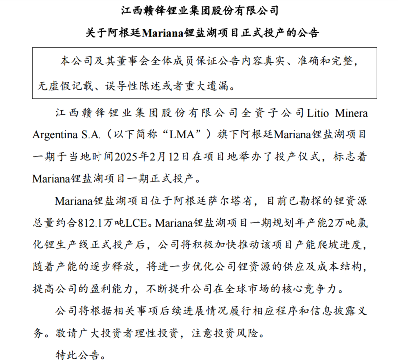 近日,赣锋锂业发布公告称,公司全资子公司Litio Minera Argentina S.A.旗下阿根廷Mariana锂盐湖项目一期于当地时间2025年2月12日举办投产仪式,正式投产。